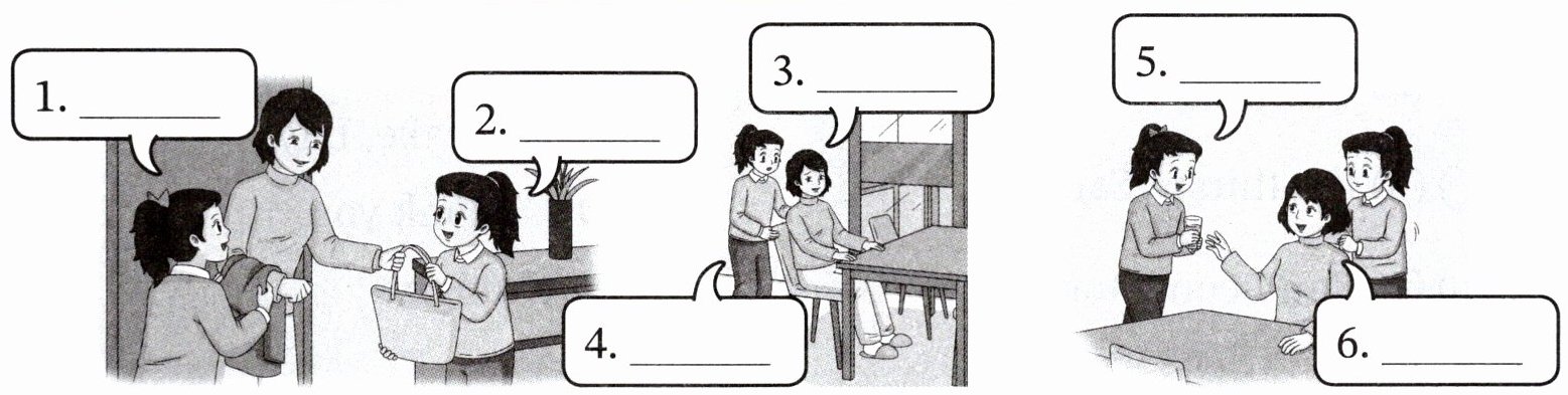 根据Story time内容,图1中孩子帮妈妈拿外套,对应F;图2中孩子帮妈妈拿包,对应C;图3中妈妈表达累了,对应D;图4中孩子让妈妈休息,对应B;图5中孩子给妈妈水,对应E;图6中妈妈感谢孩子,对应A。