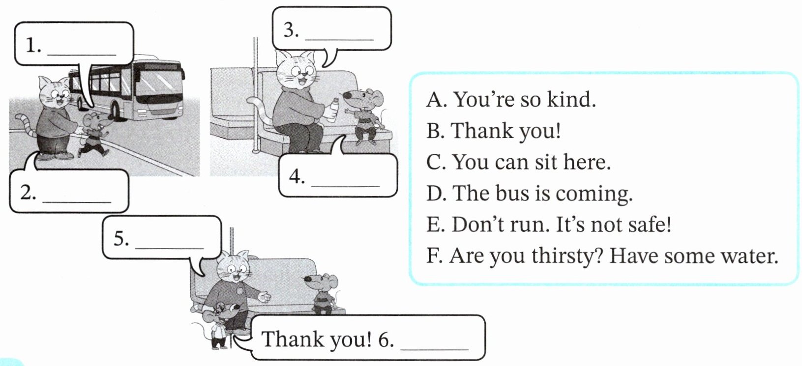 1. 图中可能是公交车即将到来的场景,选D;2. 老鼠可能在跑,猫提醒不要跑,选E;3. 猫拿着水瓶,可能问是否渴了,选F;4. 老鼠回应感谢,选B;5. 猫可能让座,选C;6. 老鼠感谢后称赞猫善良,选A。