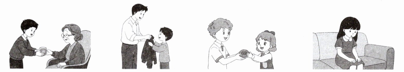 1. 仔细观察四幅图片,明确每幅图的核心动作(如:给老人递水、帮爸爸拿衣服、交换物品、独自坐着)。
