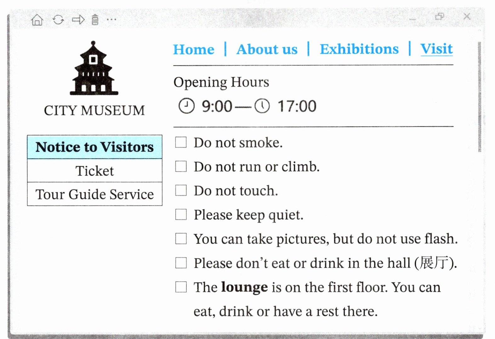 ) 3. Visitors can visit the museum (博物馆) at