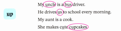 首先明确例词"up"中字母"u"的发音为/ʌ/。接着依次分析短文中画线字母"u"的发音:"uncle"中"u"发/ʌ/,"bus"中"u"发/ʌ/,"us"中"u"发/ʌ/,"cute"中"u"发/juː/,"cupcakes"中"u"发/ʌ/。所以发音与"up"相同的单词是uncle, bus, us, cupcakes。