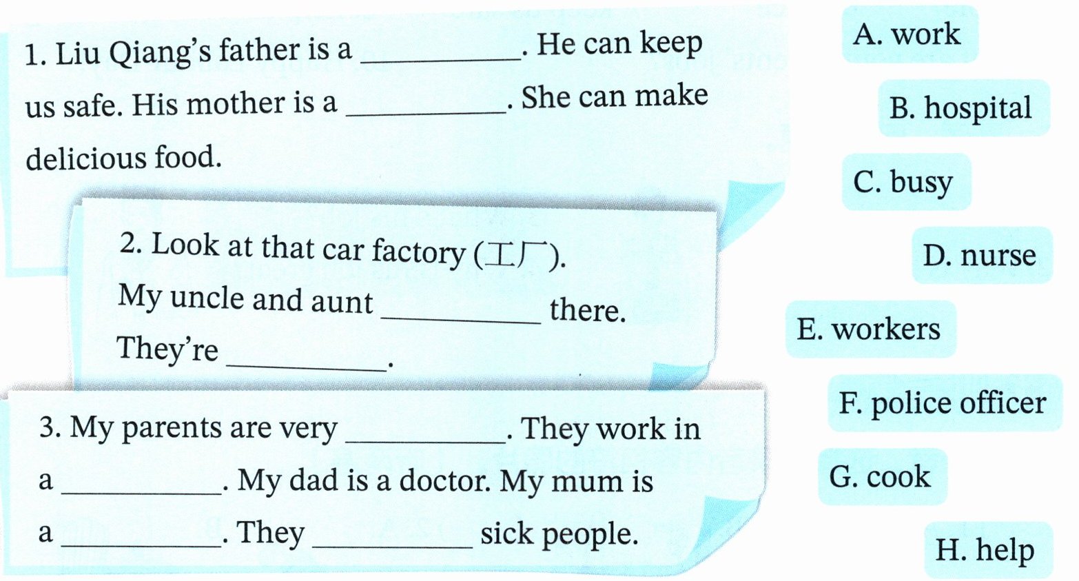 3. 第三题提到“My dad is a doctor”,因此父母工作的地方是“hospital”;妈妈是“nurse”;他们“help”病人。另外,题目中“My parents are very”后面应填“busy”,表示他们很忙。