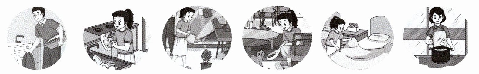 由于缺少录音内容,无法直接根据听力信息排序。通常此类题目需根据录音中描述的活动顺序与图片匹配,例如听到“wash clothes”对应洗衣图片,“wash dishes”对应洗碗图片等,按录音先后顺序填写1-6的数字。