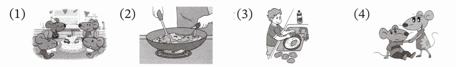 (4) 图片中显示的是两只小老鼠,其中一只在安慰另一只,需要根据录音内容判断,此场景与常见的故事情节可能相符,故打√。
