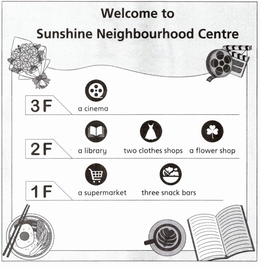 答案:示例: This is Sunshine Neighbourhood Centre. There is a supermarket on the first floor. It is very big. There are also three snack bars. We can have food and drinks there. On the second floor, there is a library. We can read books there. There are also two clothes shops and a flower shop. They are small but nice. On the third floor, there is a cinema. We can watch films there. At the weekend, we can have a good time in the neighbourhood centre.