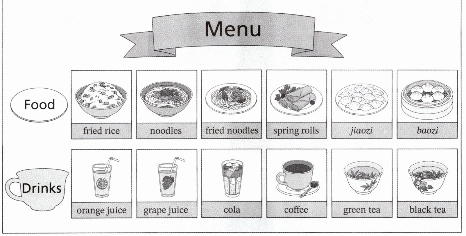 We have many drinks too. There is orange juice and grape juice. There is cola with ice. There is also coffee, green tea and black tea.
