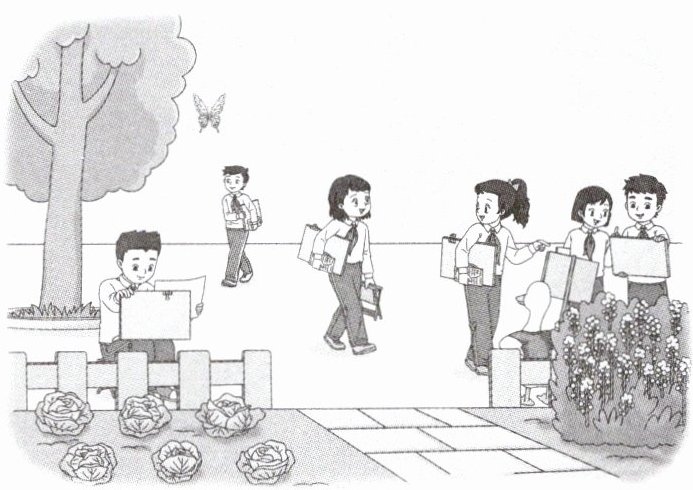 Look at the picture. My friends and I are in the school garden. It is sunny. The garden is beautiful. There are some flowers in the garden. There is also a big tree. There is a beautiful butterfly by the tree. We draw some nice pictures. We have a good time together.
