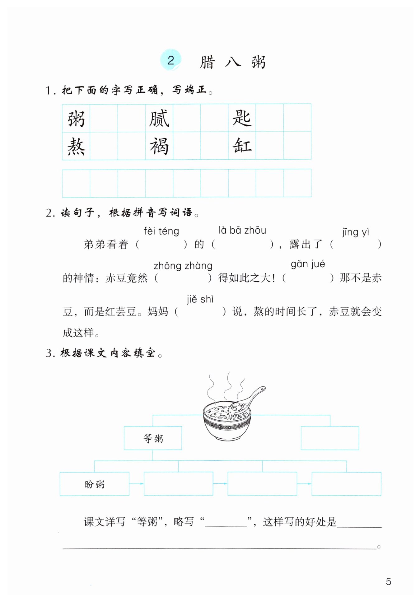 阅读全文可知,课文第1段介绍腊八粥的特点,引出下文,为写“八儿”一家熬煮腊八粥及“八儿”的“迫不及待”做铺垫,第2~19段描写煮腊八粥的过程和八儿等着喝粥的心情以及喝粥后的情态。因此整篇文章主要围绕“等粥”和“喝粥”展开。