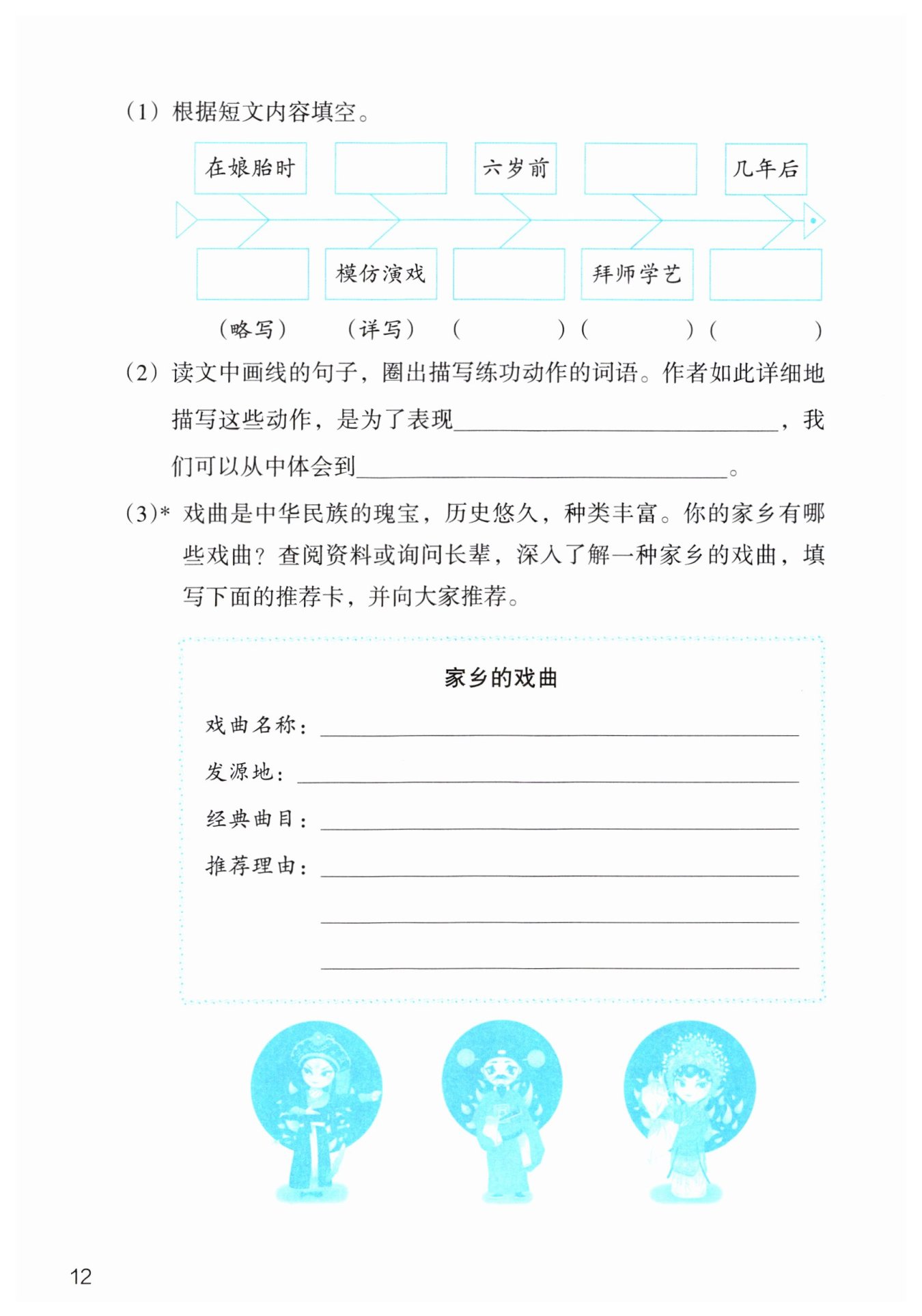 ③根据第4段“后来,更多的时间是跟随母亲演出。”从这里开始到拜师之前写的是“我”六岁前,随母亲演出,但是没有具体写演出的内容,只是交代了“场场必到”,因此是略写;