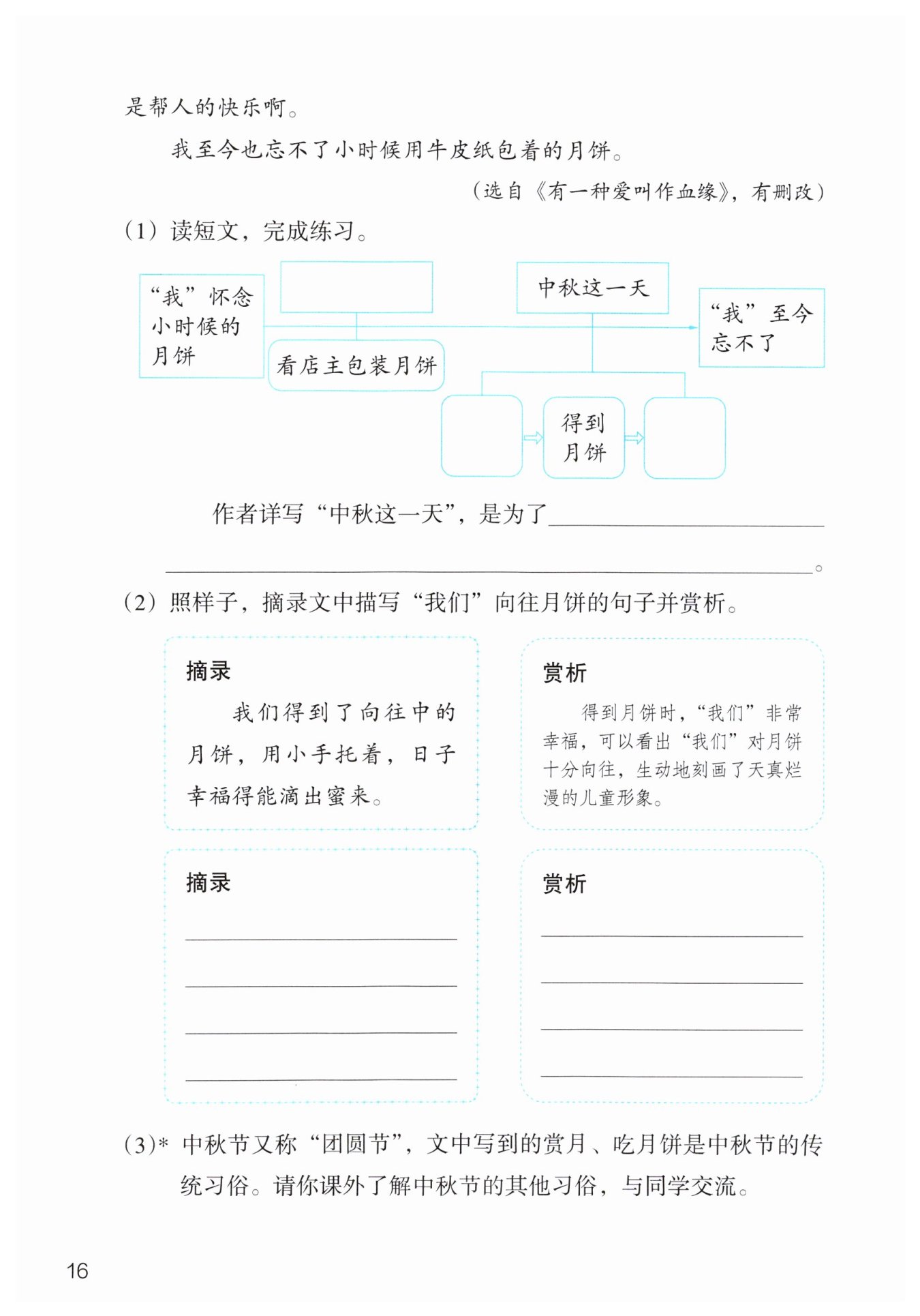 根据文章4-5段“于是我们把月饼分成一点一点的碎屑,舔着吃······大人们也一人一只月饼,但他们多半舍不得吃,藏着,只等我们嘴馋了时,分了去吃。”可知,这里写的是“分食月饼”。