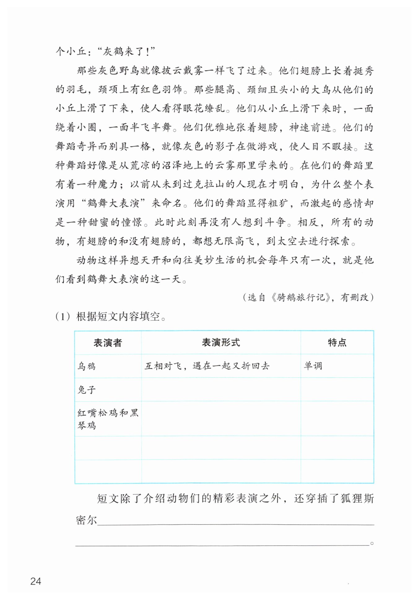 灰鹤——根据第10段“‘灰鹤来了’”、第11段“从小丘上滑下来时,一面绕着小圈,一面半飞半舞......他们的舞蹈显得粗犷,而激起的感情却是一种甜蜜的憧憬”可知,灰鹤的表演形式是滑下小丘、绕着小圈、半飞半舞,特点是舞蹈粗犷,感情是甜蜜的憧憬。