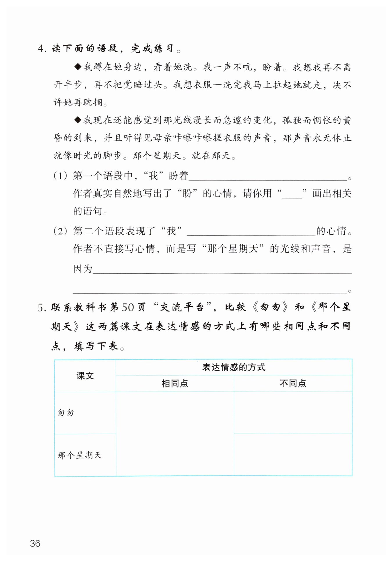 ①根据教科书第50页第一段总起句“写文章就像说话一样,要抒发自己的真实情感”以及其后《匆匆》和《那个星期天》的举例说明可知,《匆匆》和《那个星期天》表达情感的方式相同点在于都表达了作者的真情实感。
