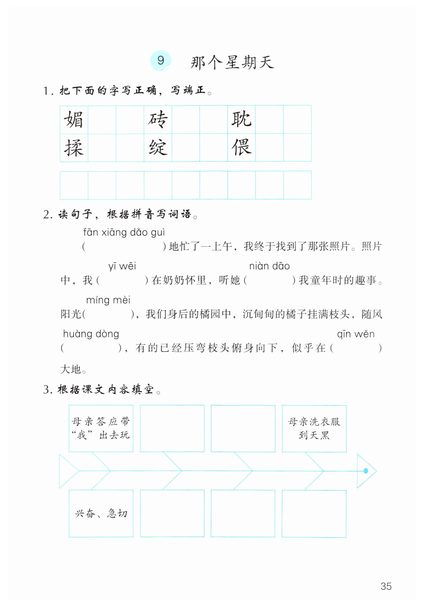阅读题干可知,第一行填的是母亲的活动,第二行填的是“我”的心情。根据题干中的“母亲答应带 ‘我’出去玩”“母亲洗衣服到天黑”可定位到第2段的“那个星期天母亲答应带我出去”、第6-7段的“醒来时我看见母亲在洗衣服。要是那时就走还不晚”“我现在还能感觉到那光线漫长而急遽的变化,孤独而惆怅的黄昏的到来,并且听得见母亲咔嚓咔嚓搓衣服的声音”,由此可知,母亲的其他两个活动要在3-5段去寻找。