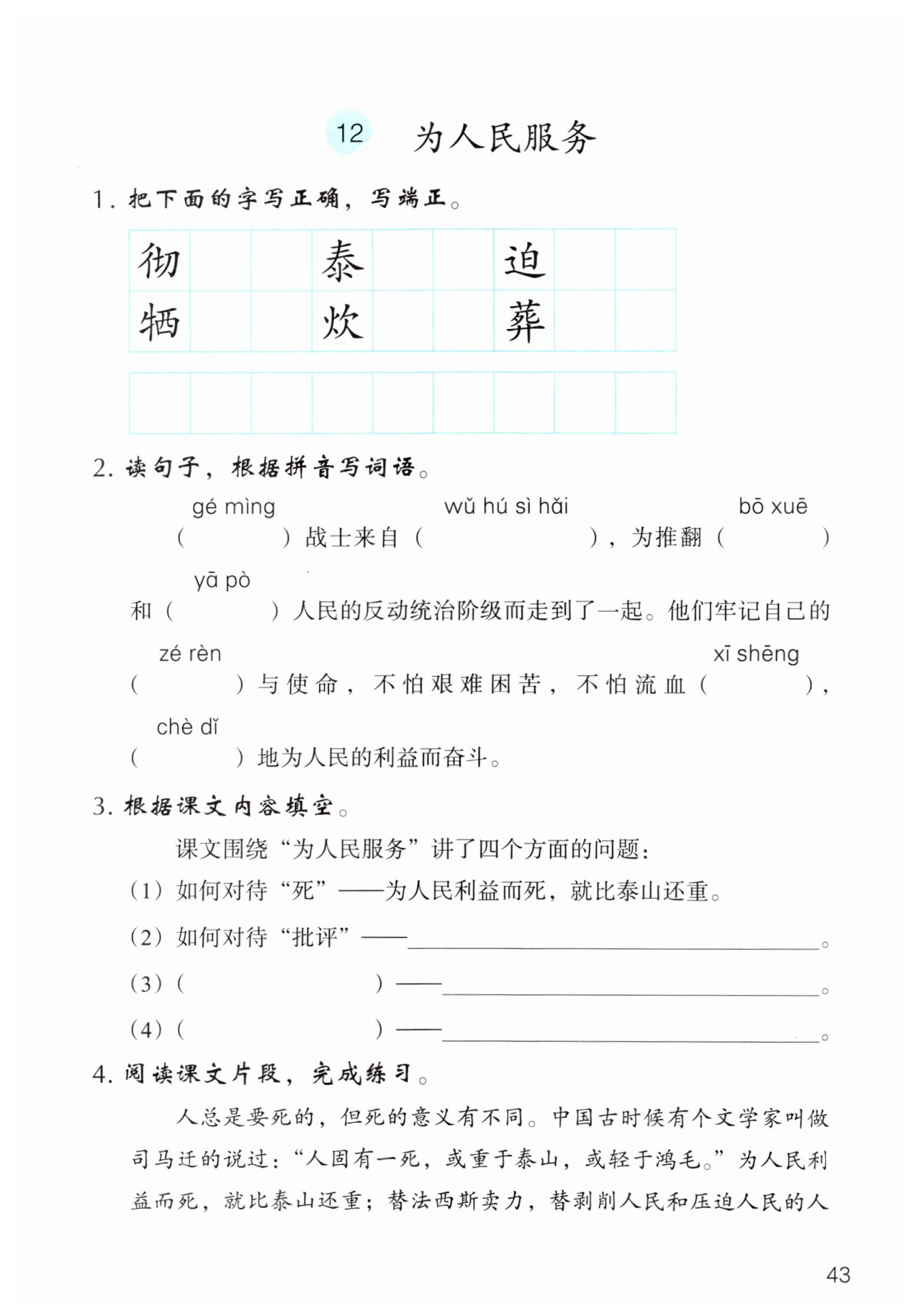 由第2段“人总是要死的,但死的意义有不同。”可知本段讲的是如何对待“死”,下文提出“为人民利益而死,就比泰山还重”的观点。