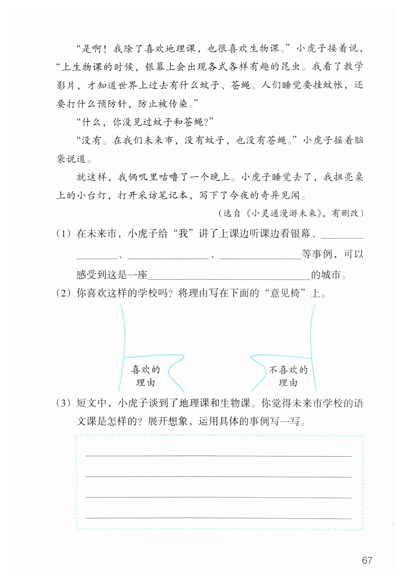 第19段“生物课的时候,银幕上会出现各式各样有趣的昆虫。我看了教学影片,才知道世界上过去有什么蚊子、苍蝇。人们睡觉要挂蚊帐,还要打什么预防针,防止被传染。”可知,小虎子给“我”讲了生物课观看教学影片这一事例。