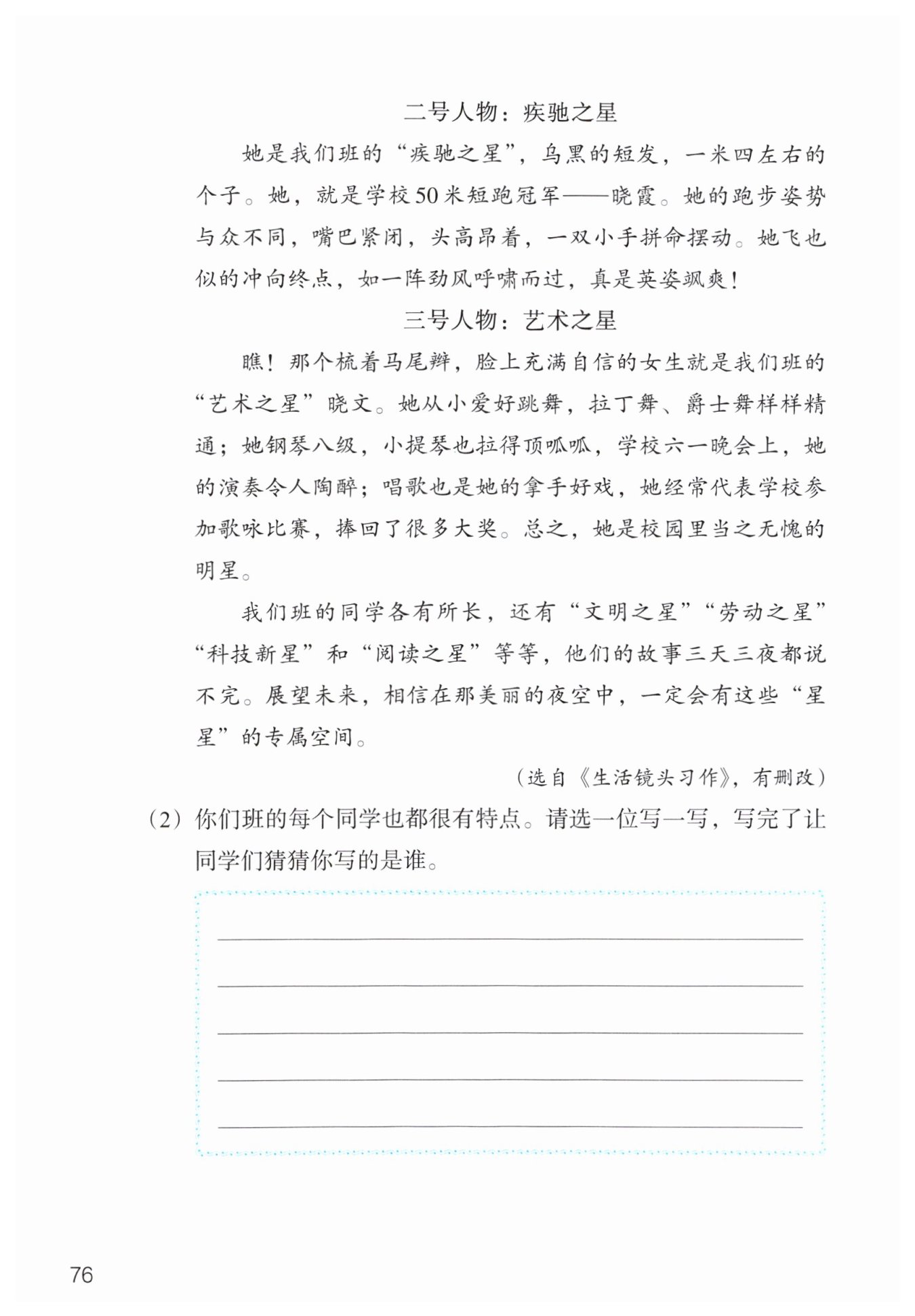 ①在写“一号人物:学习之星”时,围绕人物个性化特点——爱学习,写了她爱思考(总是低着头,似乎在思考问题)、上课认真听讲(上课时,她总是目不转睛地盯着讲台上的老师)、下课积极提问(下课时,她总是跟在老师后面问这问那)这些具体内容。