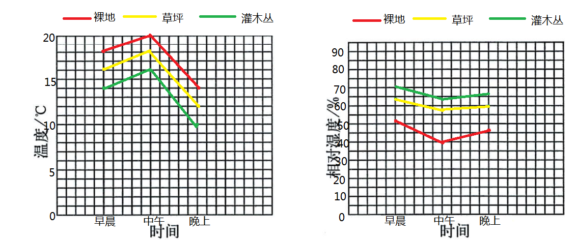 同一时间段,裸地的温度最高,相对湿度最低;灌木丛的温度最低,相对湿度最高。