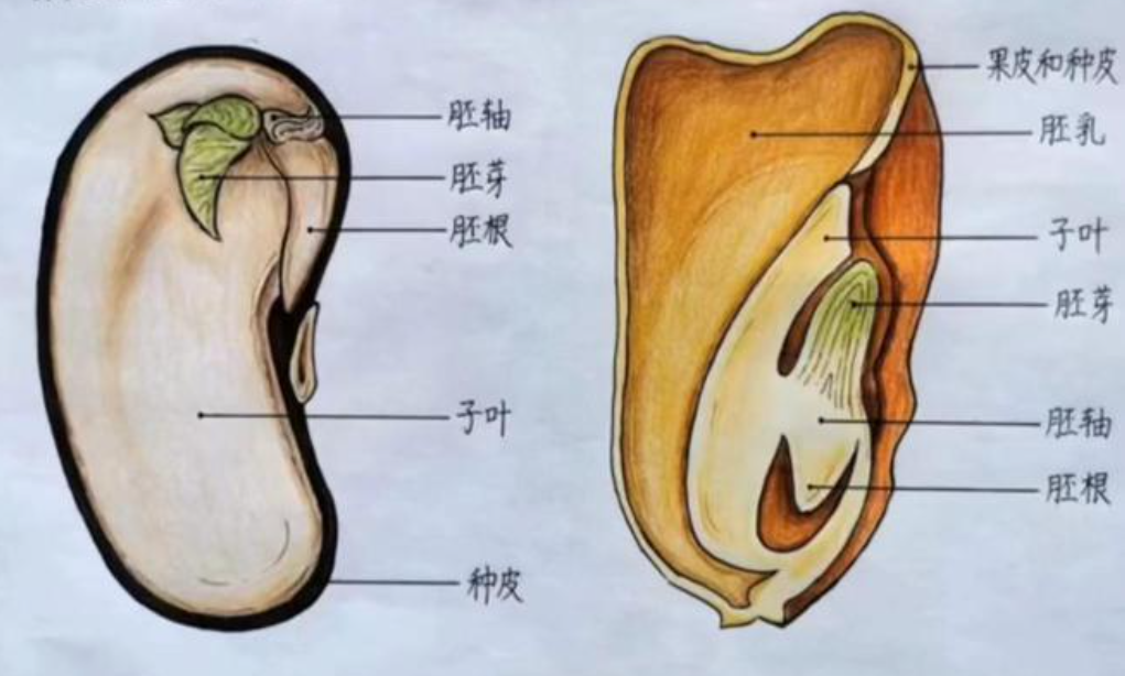 蚕豆种子由种皮和胚组成,玉米种子由种皮、胚和胚乳组成。种皮的作用是保护内部结构,