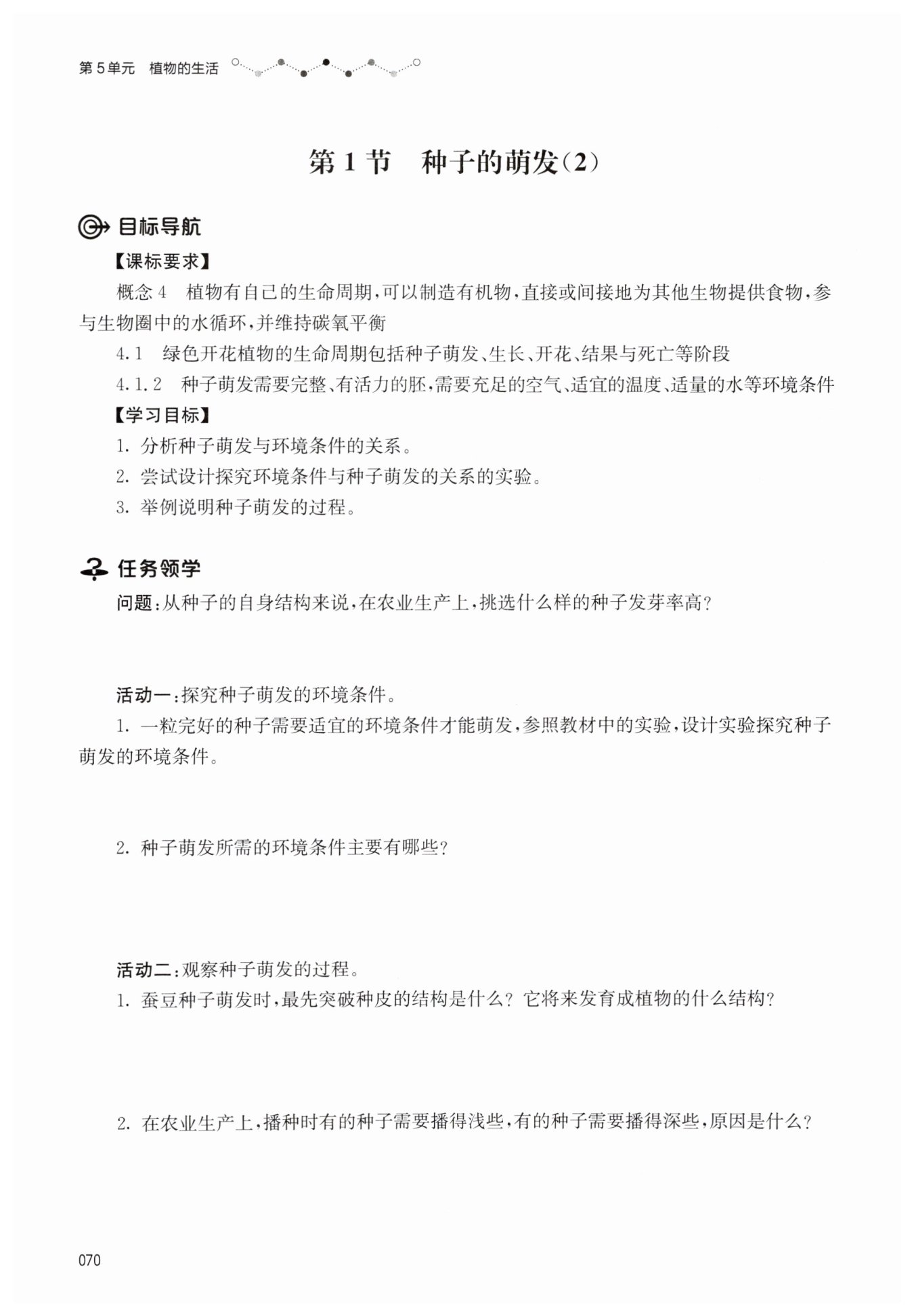 制订计划:将2颗大豆种子分别放在不同条件的土壤中,1号种子有充足的水分,适宜的温度
