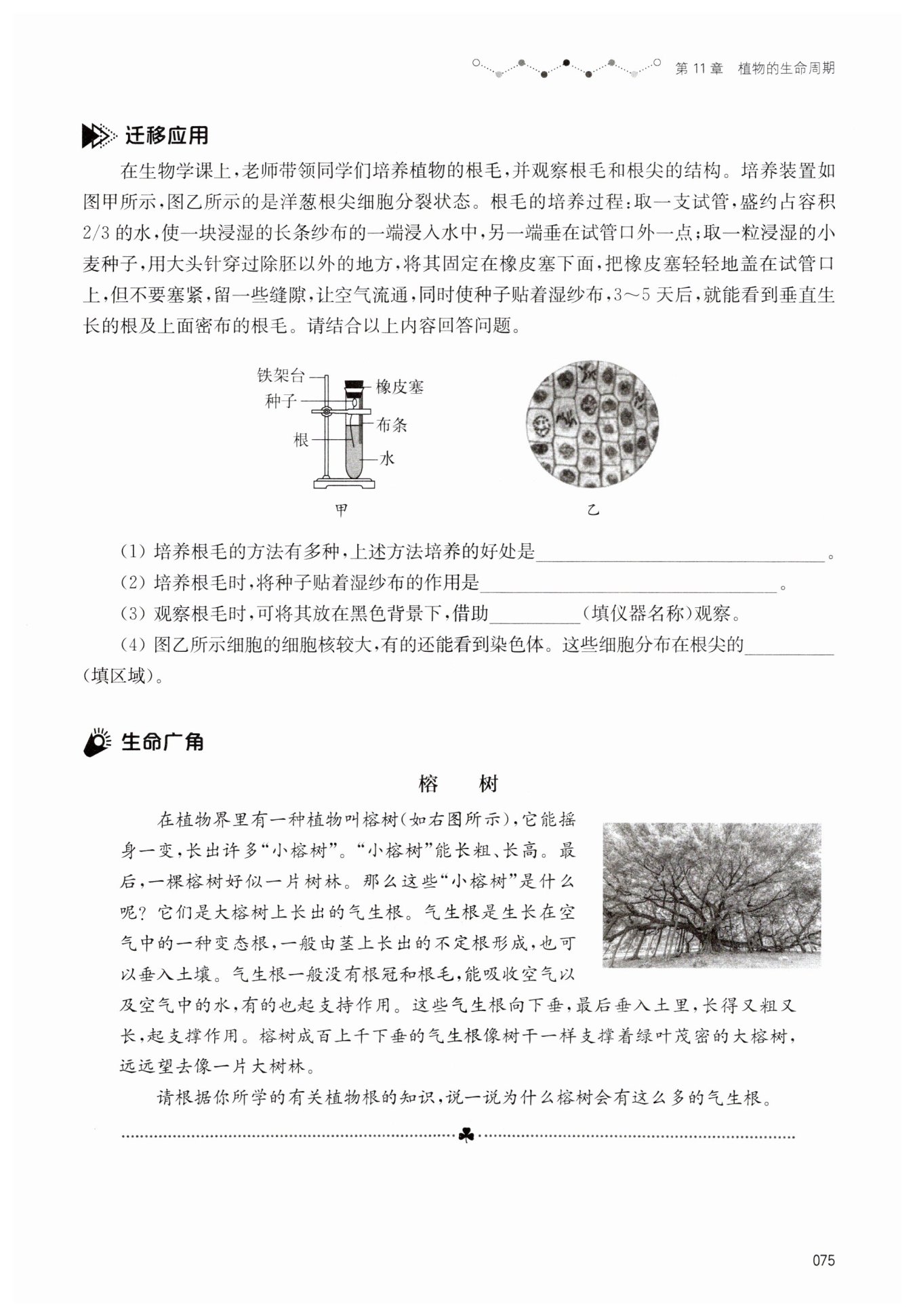 根垂直生长,根尖和根毛容易观察