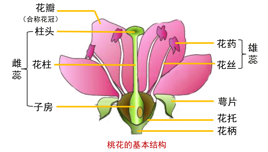 一朵桃花的结构包括花柄、花托、花萼、花瓣、雄蕊和雌蕊等。雄蕊和雌蕊是花的主要