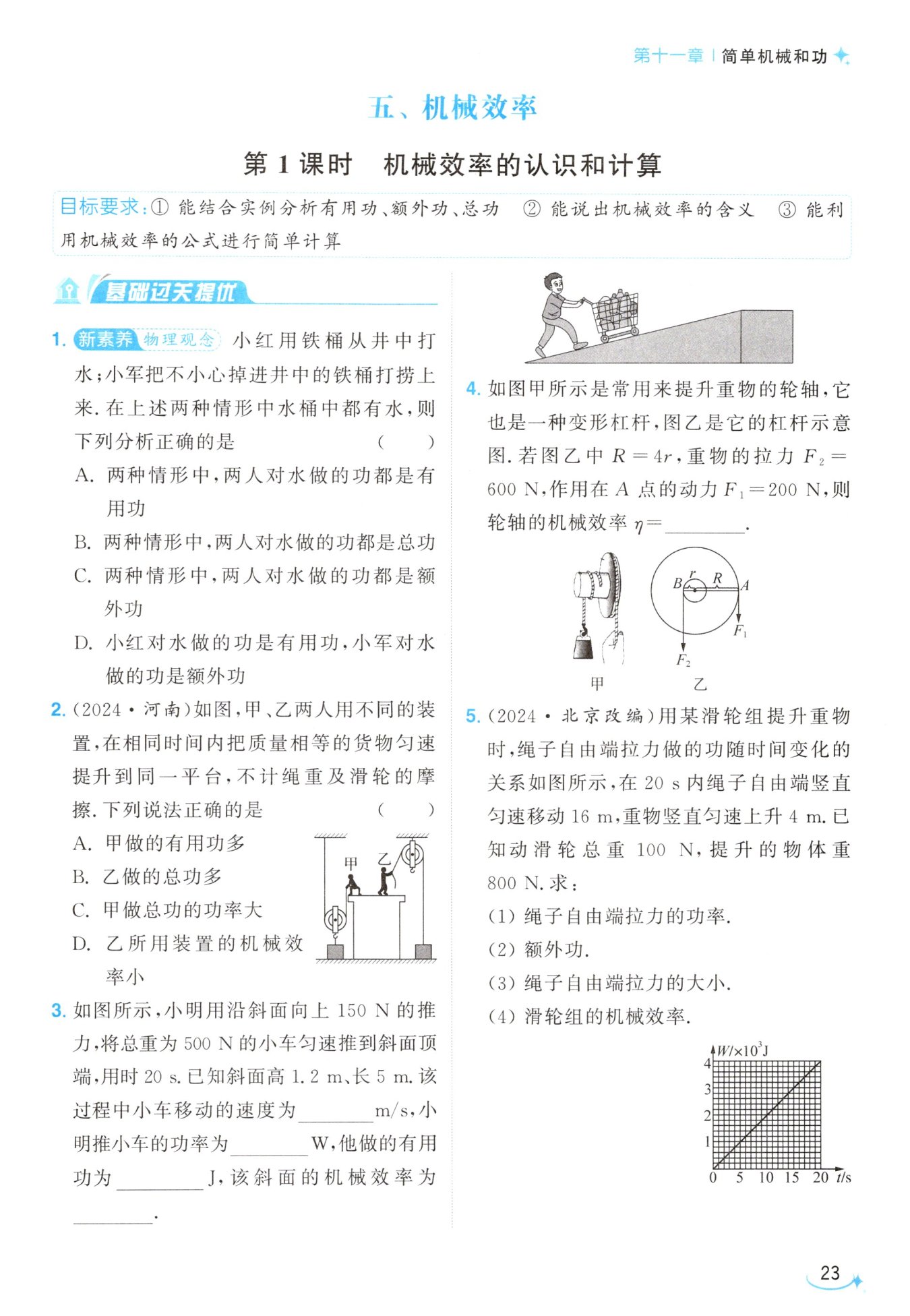 解:(1)由图可得,20 s内绳子拉力做的功$W_{总}=4\times10^{3}\text{ J},$则绳子自由端拉力的功率$P = \frac{W_{总}}{t}=\frac{4\times10^{3}\text{ J}}{20\text{ s}} = 200\text{ W}。$