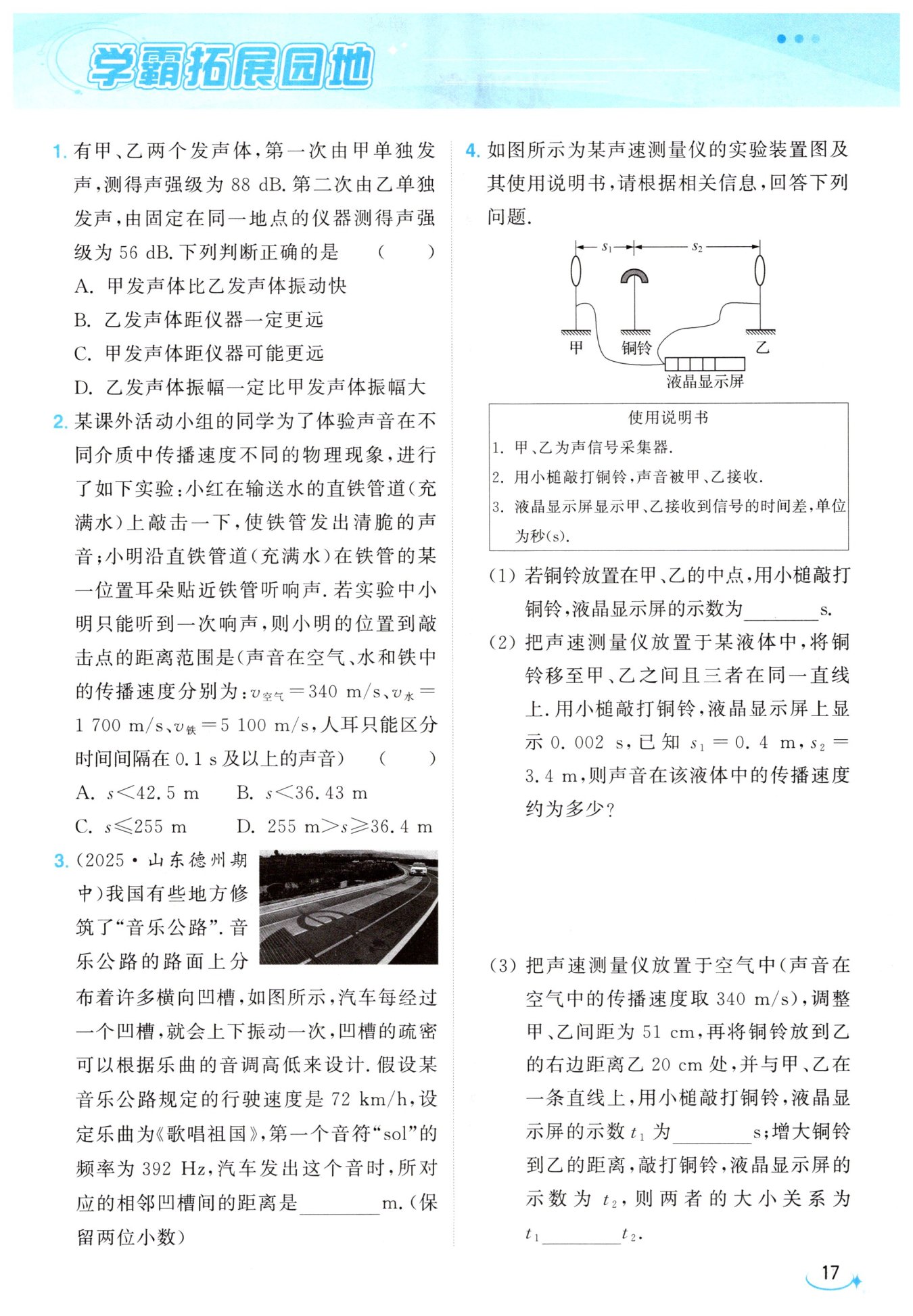 解:(2)设该液体中声速为$v,$则声音从铜铃传到甲的时间$t_{甲}=\frac{s_{1}}{v},$声音从铜铃传到乙的时间$t_{乙}=\frac{s_{2}}{v},$由题意知$t_{乙}-t_{甲}=0.002\ s,$即$\frac{s_{2}}{v}-\frac{s_{1}}{v}=\frac{3.4\ m}{v}-\frac{0.4\ m}{v}=0.002\ s,$