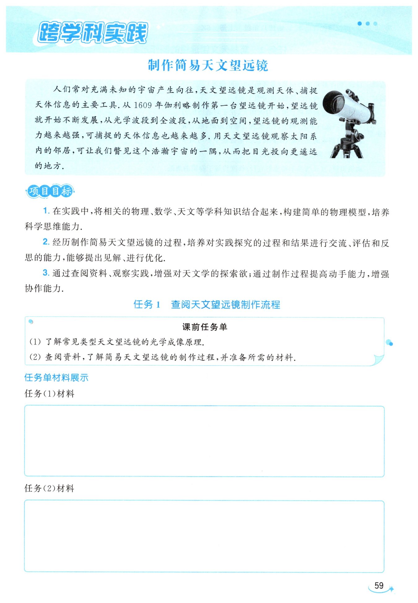 常见的望远镜类型有折射式望远镜和反射式望远镜。折射式望远镜包括伽利略望远镜(凹透镜作目镜,结构简单、光能损失少、镜筒短且成的像是正像,缺点是倍数小、视野窄,一般只用于观剧镜和玩具望远镜)和开普勒望远镜(凸透镜作目镜,视场大,但是得到的像是倒立的,需要在物镜后面添加棱镜组或透镜组来转像,使眼睛观察到正像,一般的折射望远镜都采用开普勒结构)。反射式望远镜如牛顿望远镜(凹面反射镜作物镜,优点是不存在色差,当物镜采用抛物面时,还可消去球差,但视场较小)。由于折射望远镜的成像质量比反射望远镜好、视场大、使用方便、易于维护,中小型天文望远镜及许多专用仪器多采用折射系统,但大型折射望远镜制造起来比反射望远镜困难得多,因为制造大口径的优质透镜非常困难,且存在玻璃对光线的吸收问题,所以大口径望远镜都采用反射式。