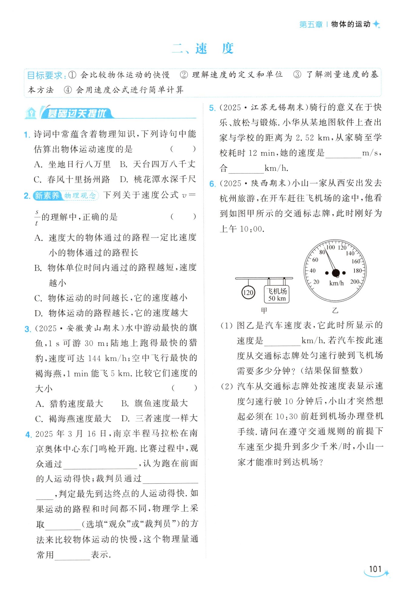 解:(1)由图乙可知,速度表的分度值为5 km/h,则此时它所显示的速度是90 km/h。由图甲可知,标志牌处距离飞机场还有50 km,按此速度行驶到飞机场需要的时间$t = \frac{s}{v} = \frac{50\ km}{90\ km/h} = \frac{5}{9}\ h \approx 33\ min。$