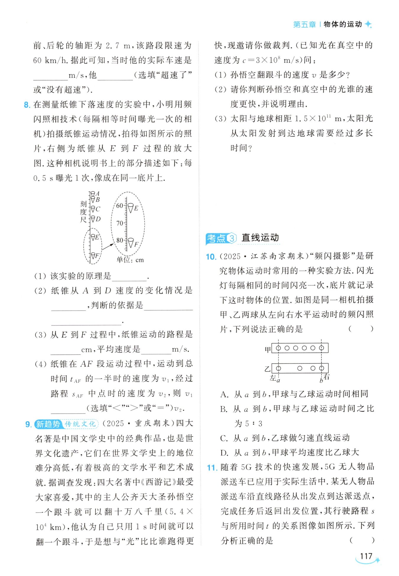(1)解:孙悟空翻跟斗的速度$v=\frac{s}{t}=\frac{5.4\times10^{4}\text{ km}}{1\text{ s}} = 5.4\times10^{4}\text{ km/s}=5.4\times10^{7}\text{ m/s}。$
