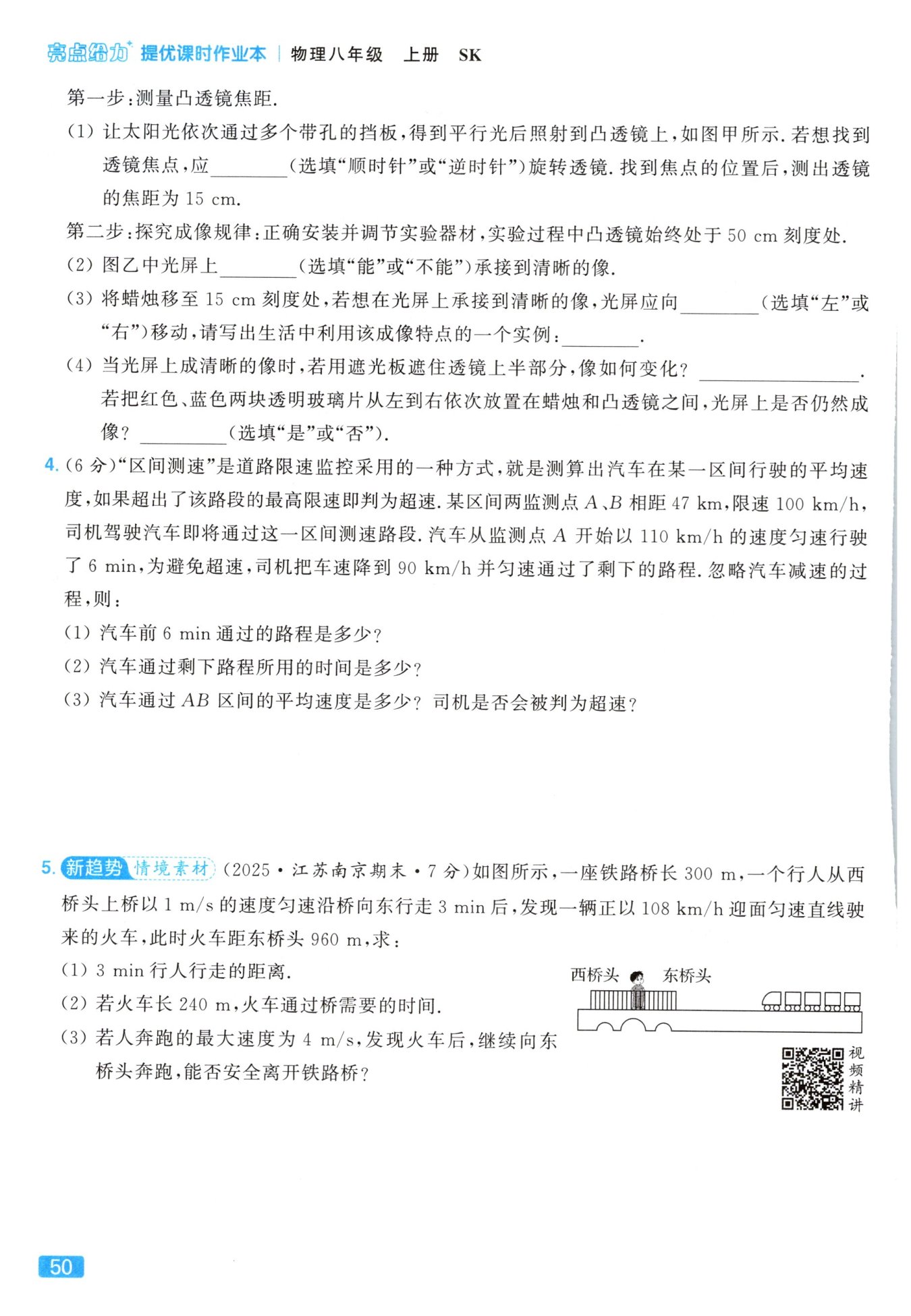 (3)人跑到东桥头至少需要的时间$t_{人东}=\frac{l_{桥}-s_{人}}{v_{人大}}=\frac{300\ m - 180\ m}{4\ m/s}=30\ s,$火车到达东桥头需要的时间$t_{车东}=\frac{s_{车东}}{v_{车}}=\frac{960\ m}{30\ m/s}=32\ s,$由于$t_{人东}<t_{车东},$所以人向东桥头奔跑能安全离开铁路桥。