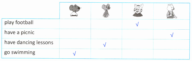 Bobby: go swimming Tina: have dancing lessons Sam: play football Billy: have a picnic