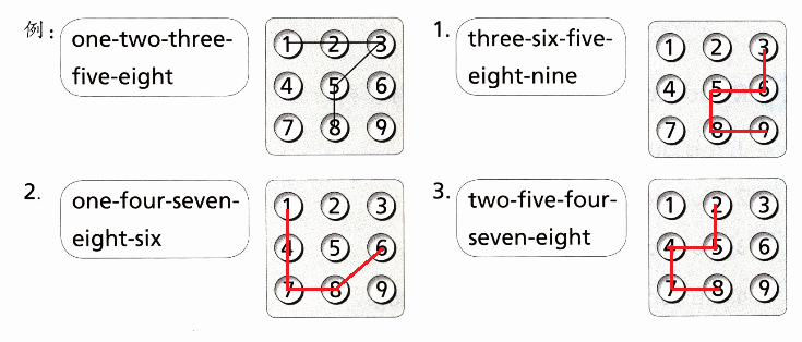 1. 从数字“three(3)”开始,依次连接“six(6)”“five(5)”“eight(8)”“nine(9)”