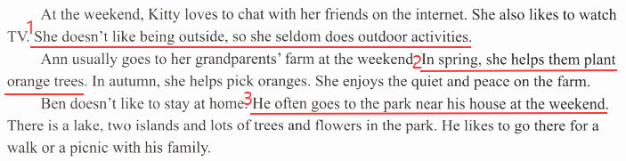 周末,基蒂喜欢和朋友们在网上聊天。她也喜欢看电视。她不喜欢在外面,所以很少做户外活动。
