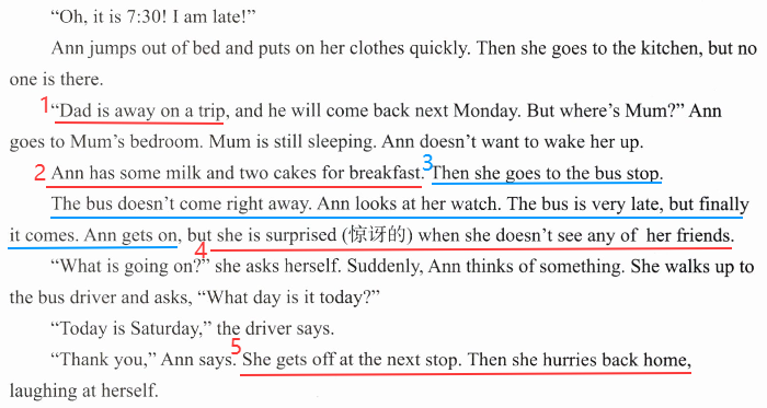 解析:文中“‘Today is Saturday,’ the driver says. ‘Thank you,’ Ann says. She gets off at the next stop. Then she hurries back home”详细描述了安得知是星期六后的行为,所以答案如此。