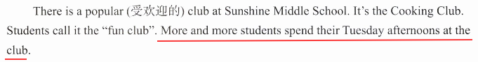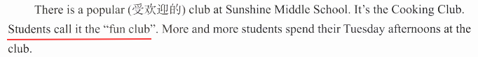 解析:文章主要介绍了阳光中学的烹饪社团,学生们觉得它有趣,以及在社团里能学到的技能,所以是关于一个趣味社团的,选A。