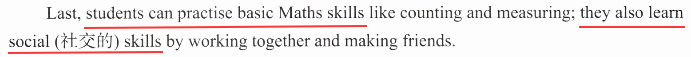 最后一段提到“students can practise basic Maths skills... they also learn social (社交的) skills”(学生们可以练习基本的数学技能……他们还学习社交技能),所以选B。