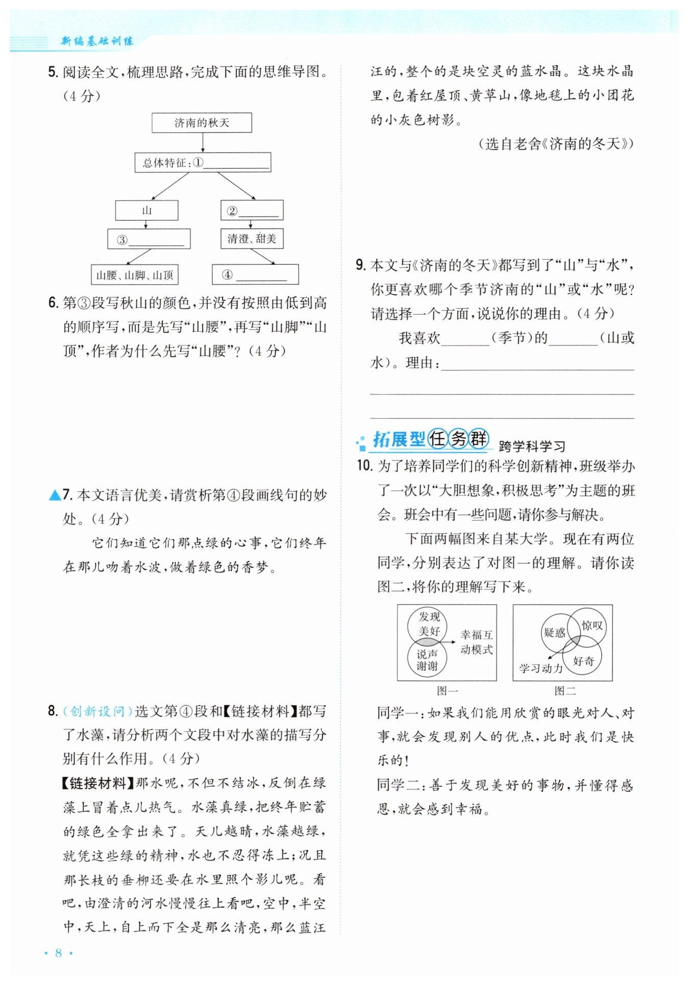 选文借写水藻的绿,突出济南秋水清澄、甜美的特点,表现济南秋天的诗意美;【链接材料】借写水藻的绿,突出济南冬水充满生机的特点,表现济南冬天的温晴。(意思对即可)