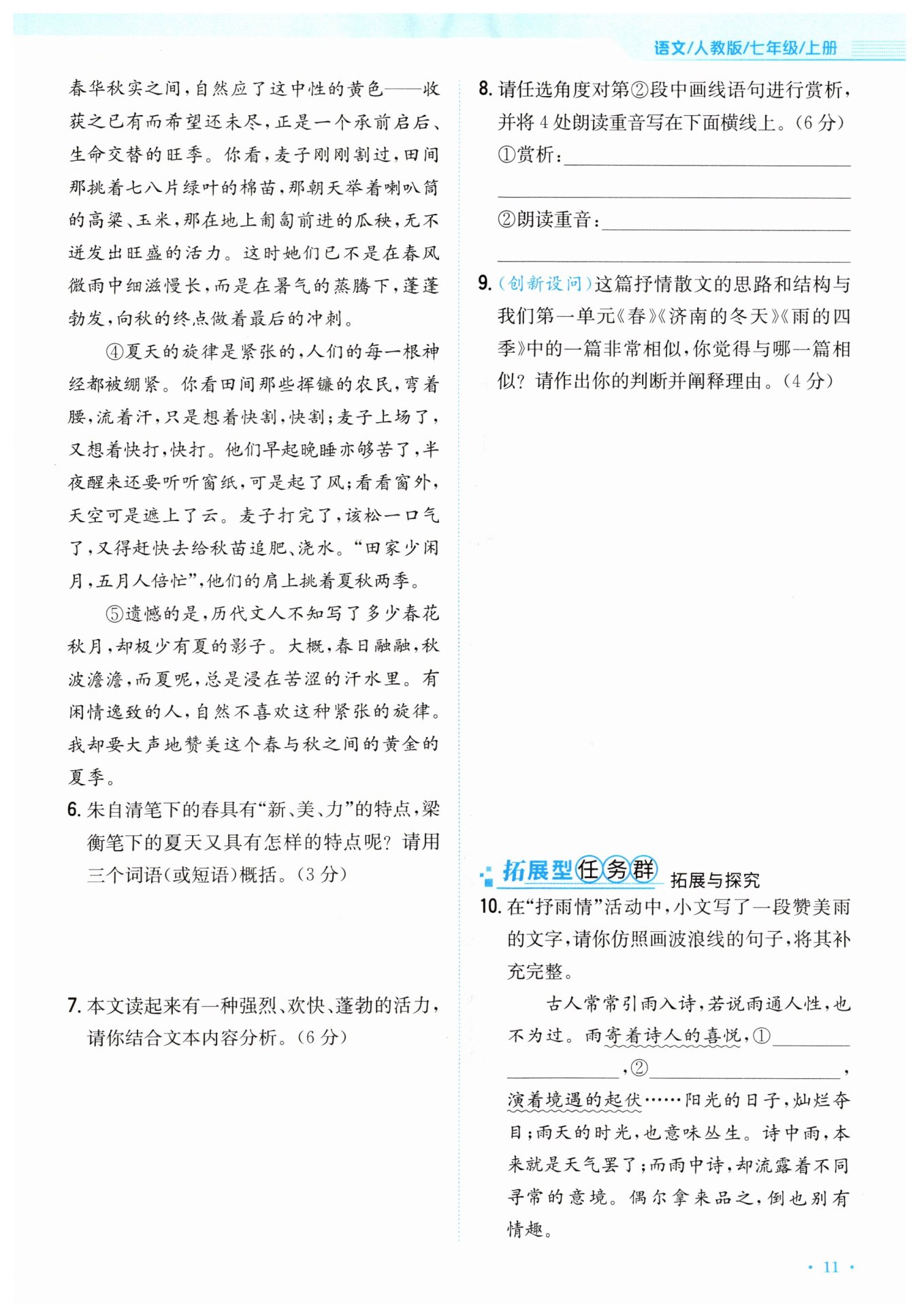 我觉得本文与《雨的四季》的思路和结构相似。《雨的四季》的思路结构是“表达对雨的喜爱—分别描绘四季之雨的特点和景致—再次表达对雨的喜爱和赞美”,《夏感》的思路结构是“夏天的特征—描绘夏天的各方面—表达对夏天的赞美之情”。采用的都是“总—分—总”的结构。