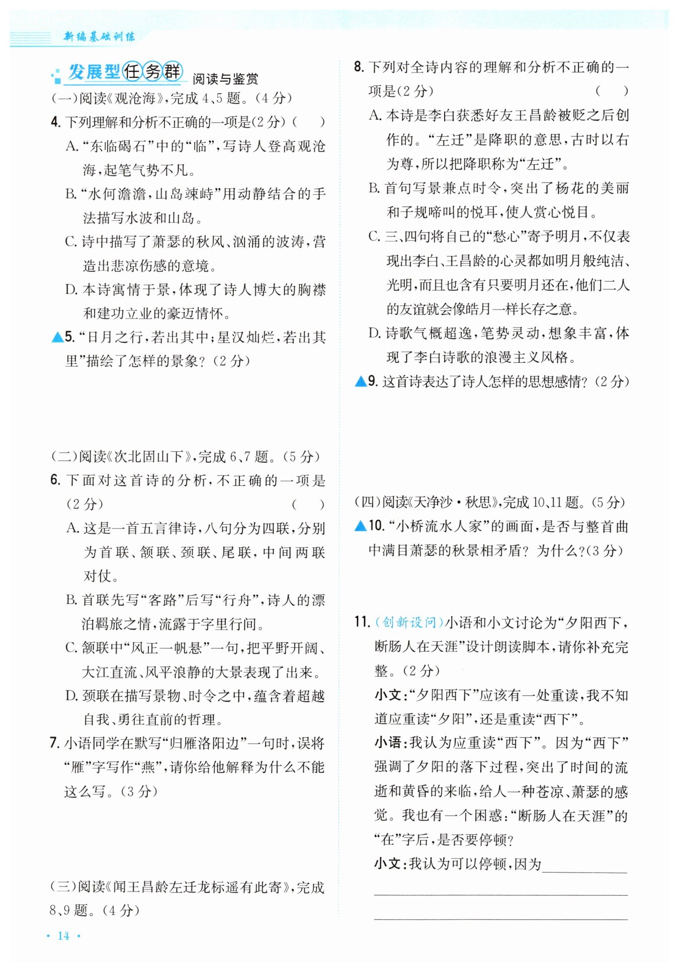 (示例)“雁”在古诗中常用来作为游子思乡的寄托。在这首诗中,诗人希望北归的大雁捎一封家书到洛阳,应该用“雁”。而“燕”是春天的象征,用在此处不合理。