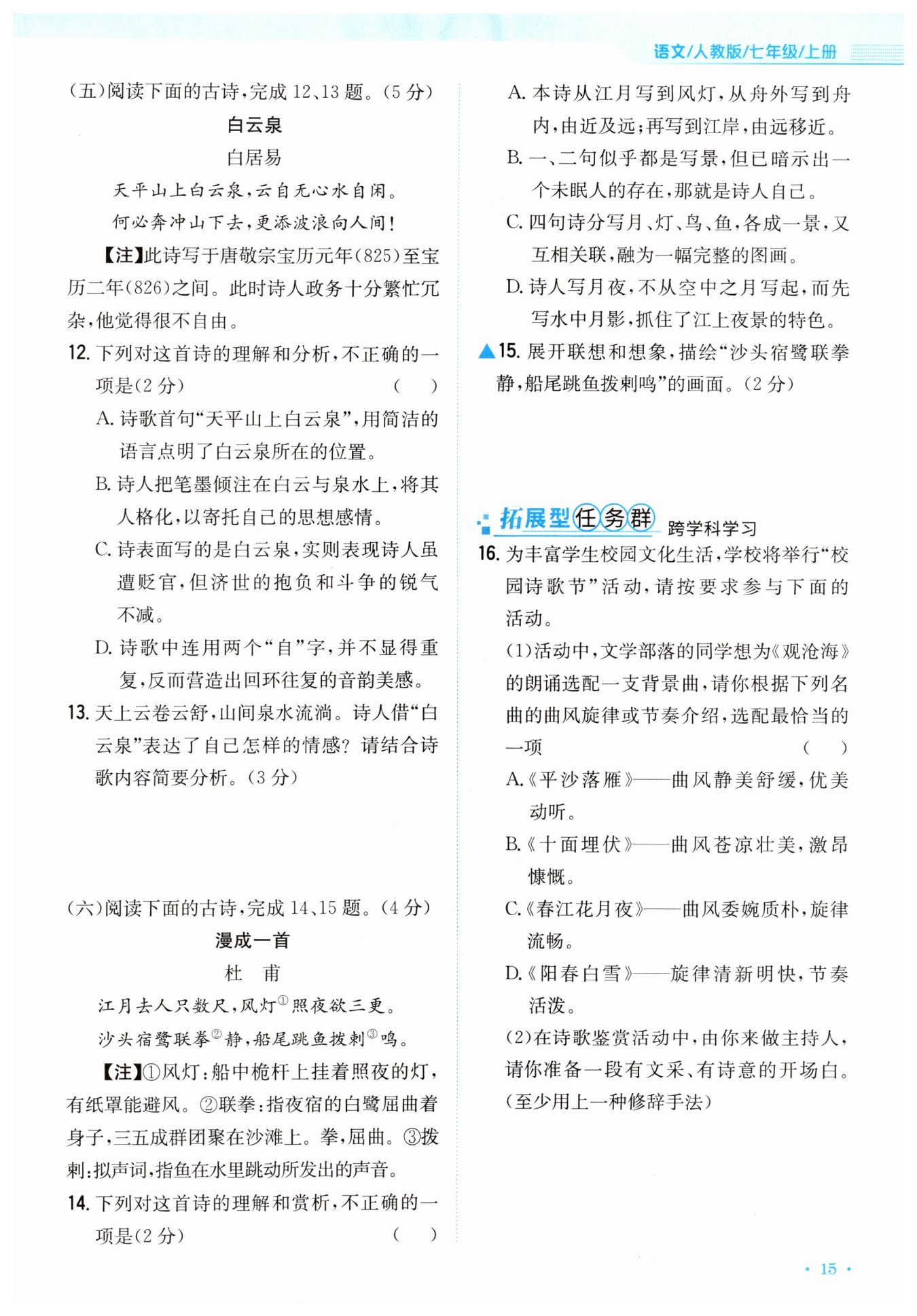 (示例)诗人借“白云泉”表达了对自由自在生活的向往。通过描绘白云的自由飘逸与泉水的自在流淌,寄托了诗人对官场的厌倦、对自由生活的向往之情。