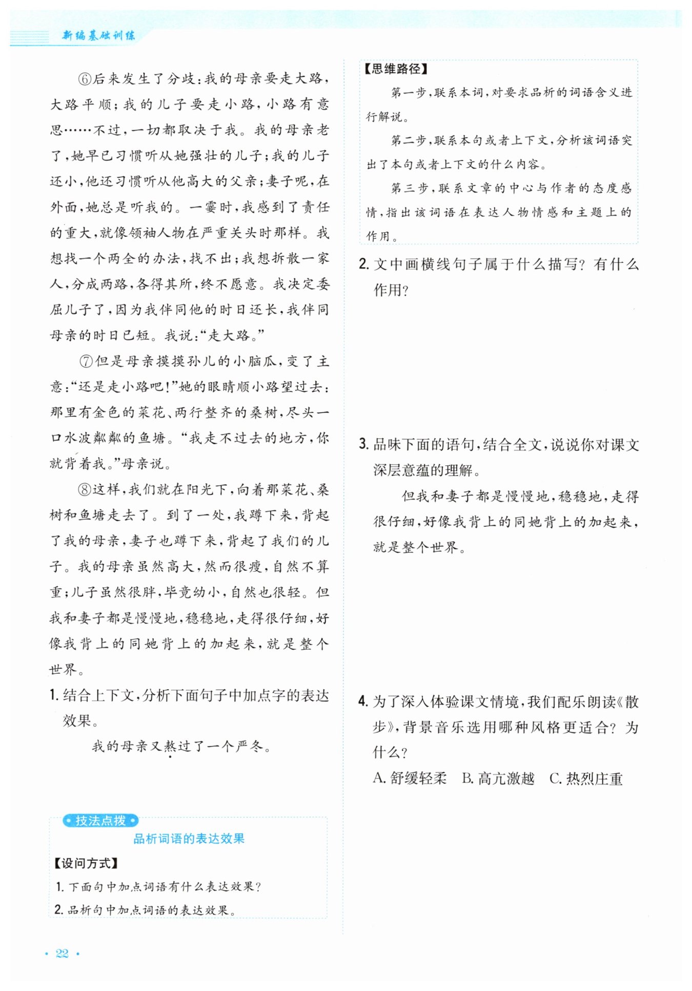 选舒缓轻柔风格的音乐更适合。因为《散步》这篇文章的整体氛围是温馨、和谐且充满家庭亲情的。文章描写了一家人在田野散步过程中的温馨场景,如欣赏初春田野的景色、家庭成员之间的互动等情节,没有激烈的冲突和激昂的情绪。舒缓轻柔的音乐能够更好地配合文章的节奏,让读者在聆听朗读时更能沉浸在这种轻松、惬意的家庭氛围之中,与文中展现的亲情之美相得益彰。
