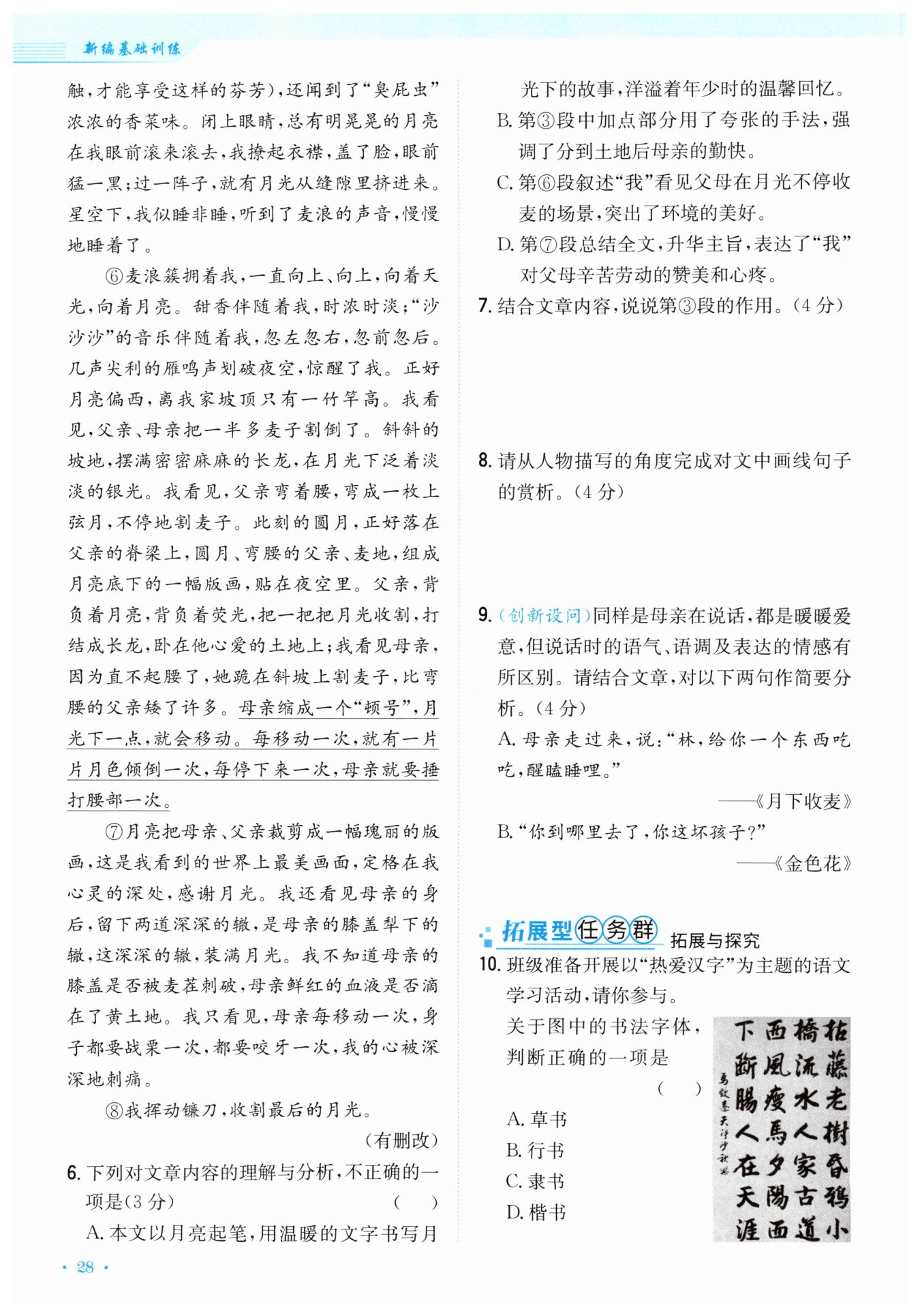 运用插叙,内容上写出了父母在分到土地后激动喜悦的心情,突出了父母的朴质勤劳,为下文父母在月色下割麦作铺垫,丰富了文章的内容,使人物形象更加丰满。