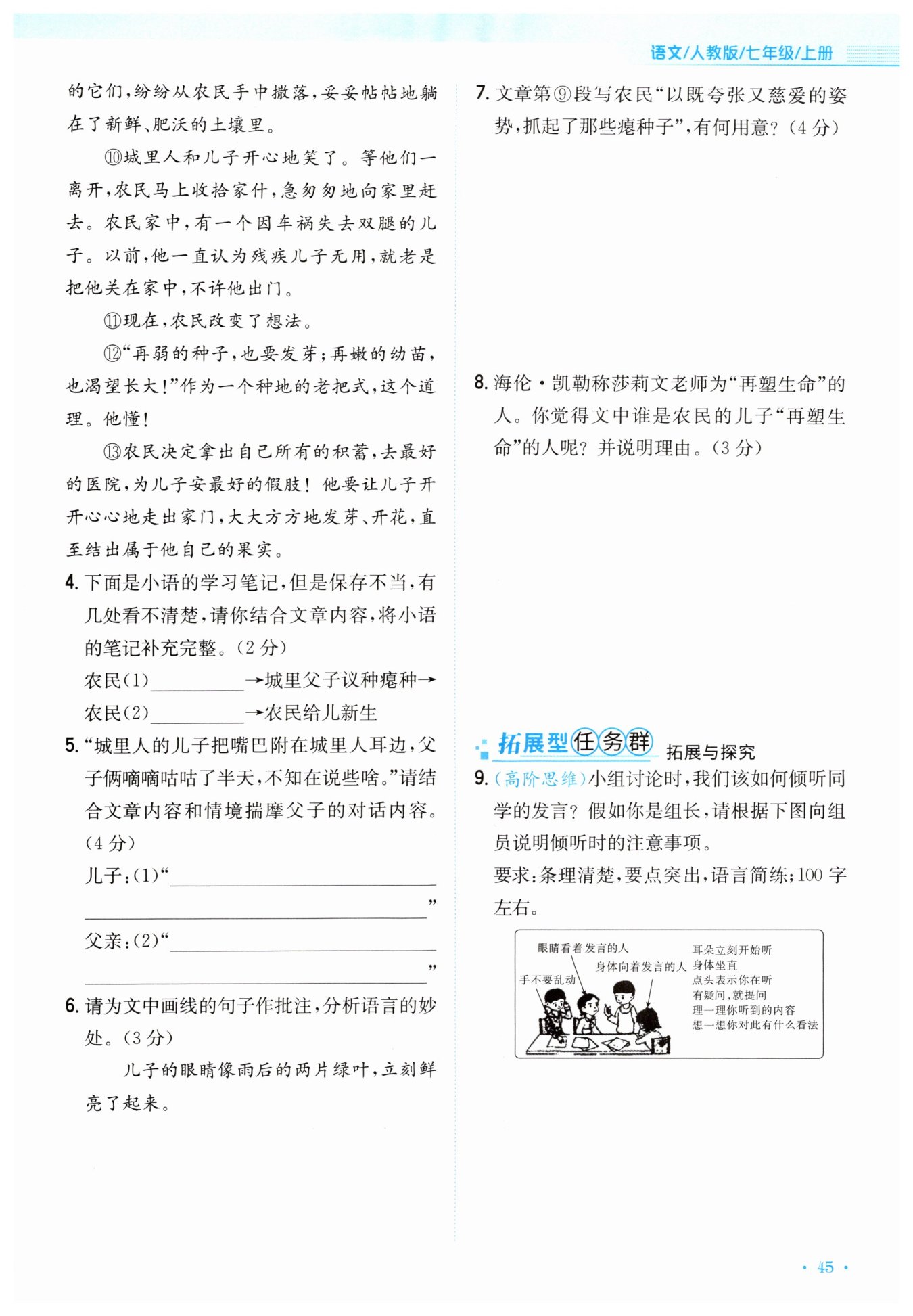 同学们,别人开始发言时,我们应该立刻倾听。人要坐端正,身体朝向发言的人,手不要乱动,眼睛看着对方。倾听过程中,可以点头表示回应,并整理听到的内容,想一想自己有什么看法。如有疑问,可以提出。