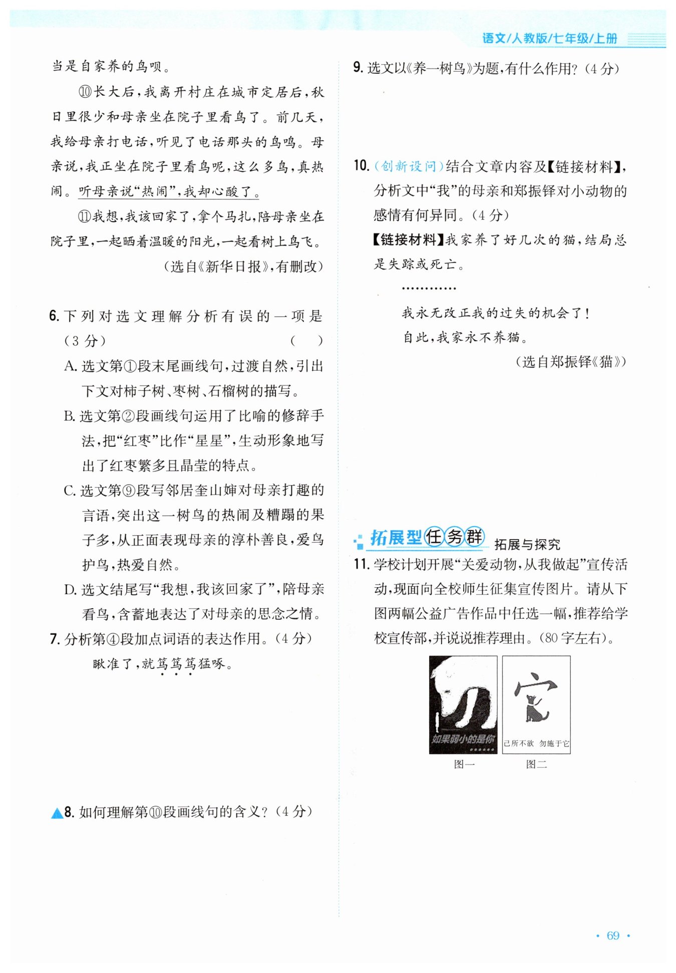 同:文中“我”的母亲和郑振铎对小动物都有怜爱之心。异:“我”的母亲对所有的鸟都一样喜爱;郑振铎凭自己好恶,带着私人的偏见去对待第三只猫。
