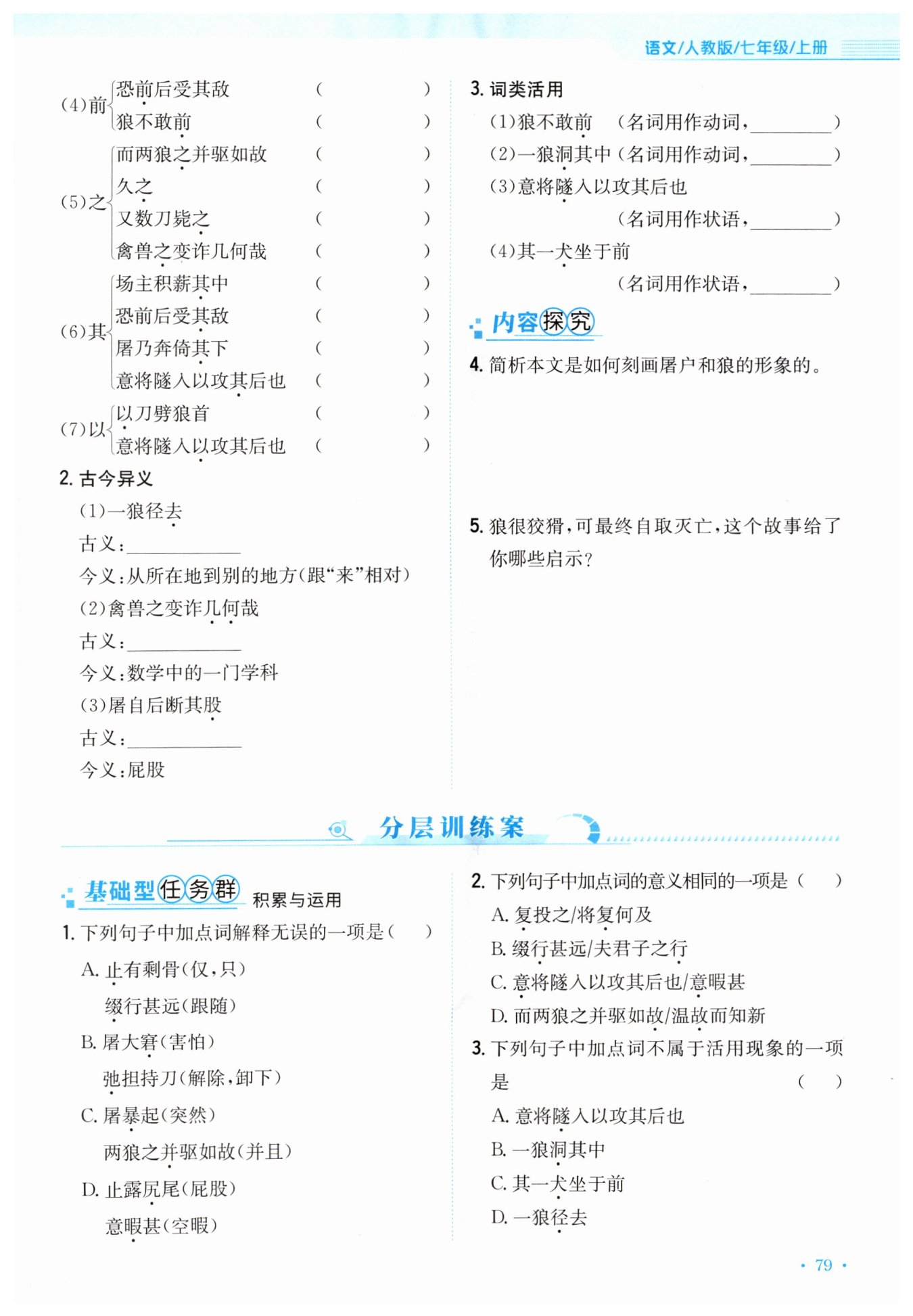 文章主要通过动作、神态描写来刻画屠户和狼的形象,从而展开双方的矛盾和斗争。“缀行甚远”“并驱如故”等,表现了狼的贪婪凶狠;“狼不敢前,眈眈相向”“径去”“犬坐”“目似瞑,意暇甚”“洞其中”等,表现了狼的狡诈。“惧”“投以骨”“复投之”等,表现了屠户害怕和侥幸的心理;“顾”“奔倚”“弛”“持”等,表现了屠户丢掉幻想准备抵抗的决心和行动;“暴起”“劈”“毙”“转视”“断”等,体现出屠户勇敢机智的斗争精神。