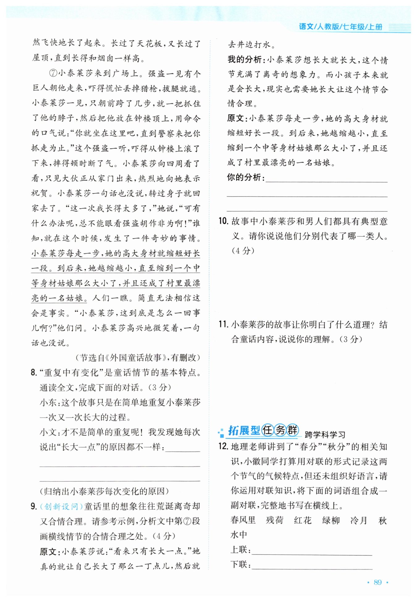 (示例一)她为对付强盗而变成巨人,说明一个道理:任何人只要敢于同坏人作斗争,就能成为一个顶天立地的巨人。