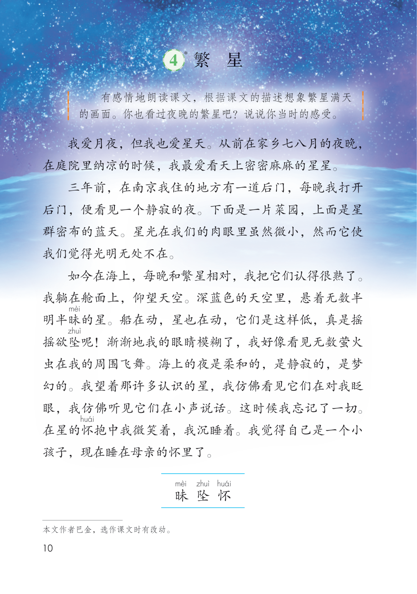 “每晚”一词表现了作者对繁星的喜爱程度之深,通过“静寂的夜”“一片菜园”“星群密布的蓝天”描写了作者观看星天时宁静的环境。