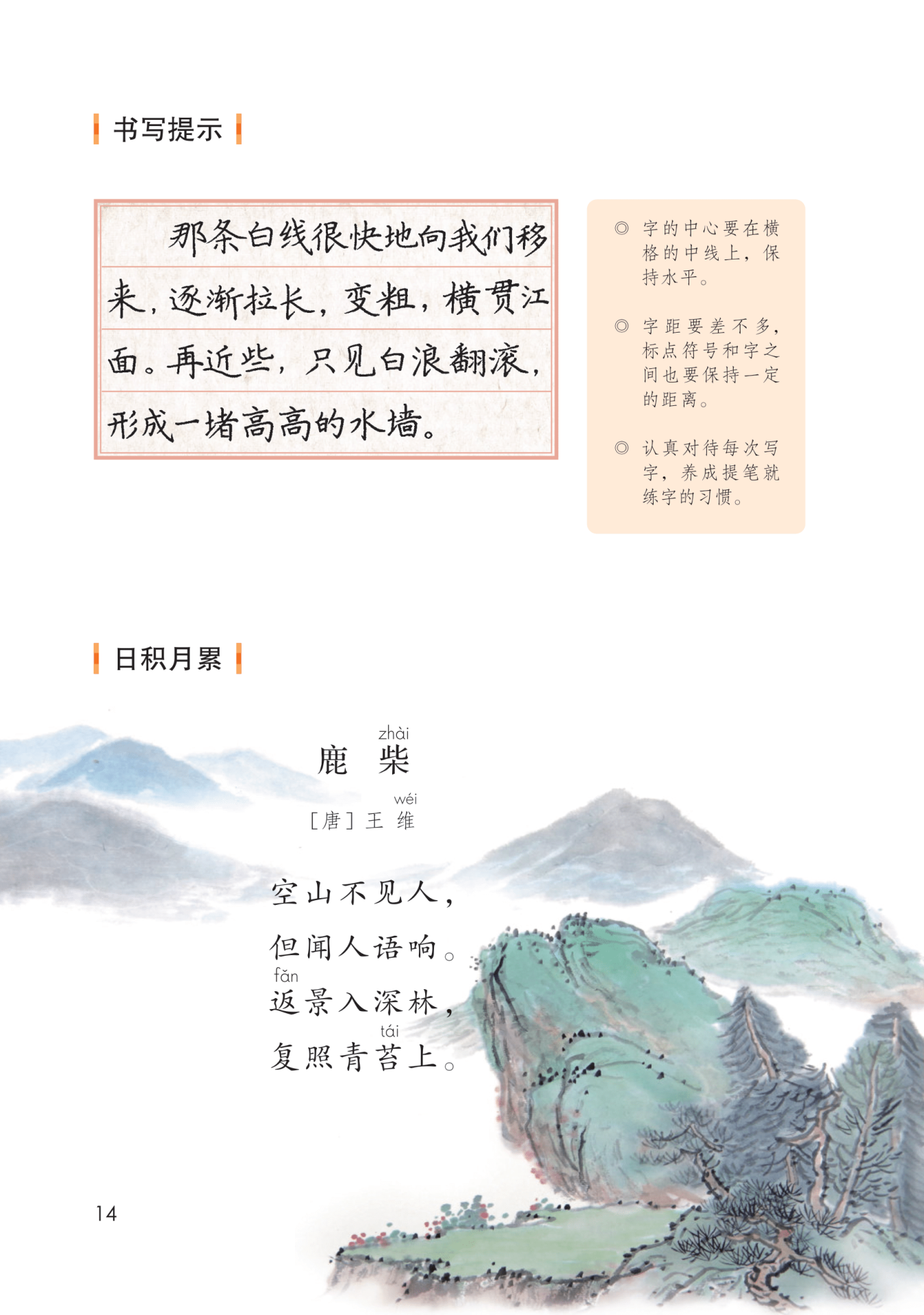 诗意:空寂的山中不见一个人,只听到一阵人语声。落日的余晖映入了深林,返照在青苔上景色宜人。