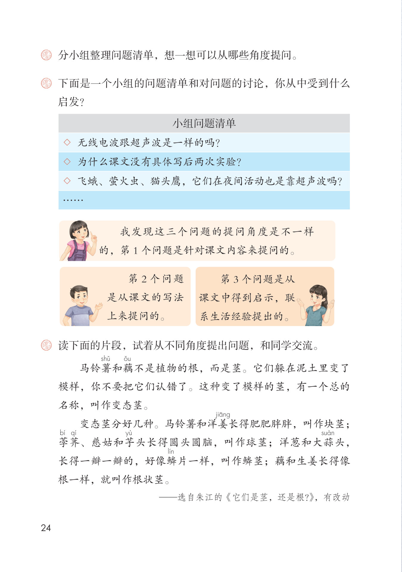 提出一个问题往往比解决一个问题更重要。我们怎样提出有价值的问题呢?我们可以从不同的角度提出问题。例如针对课文的内容提问题,可以是从某一段落(如第1自然段为什么要写飞机,而不写蝙蝠?)、某一个词语(如第7自然段中的“反复”一词写出了什么?)的角度提出问题,也可以针对全文提出问题(如科学家是怎样进行实验并得出结论的?)。只要提出的问题是值得思考或讨论的,就是可以的。